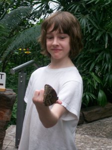 But the Butterfly House has a very soothing quality and eventually you are lulled into putting away the camera and just being there. Watching the old German ladies take pictures of orange butterflies on each other’s heads, the little boy laughing at the white butterfly that landed on his grandmother’s chest as she sat on a bench looking tentative and pleased, and Jacob, with observation and patience that he did not inherit from me, trying over and over and over to get the brown and blue butterflies to land on his finger.